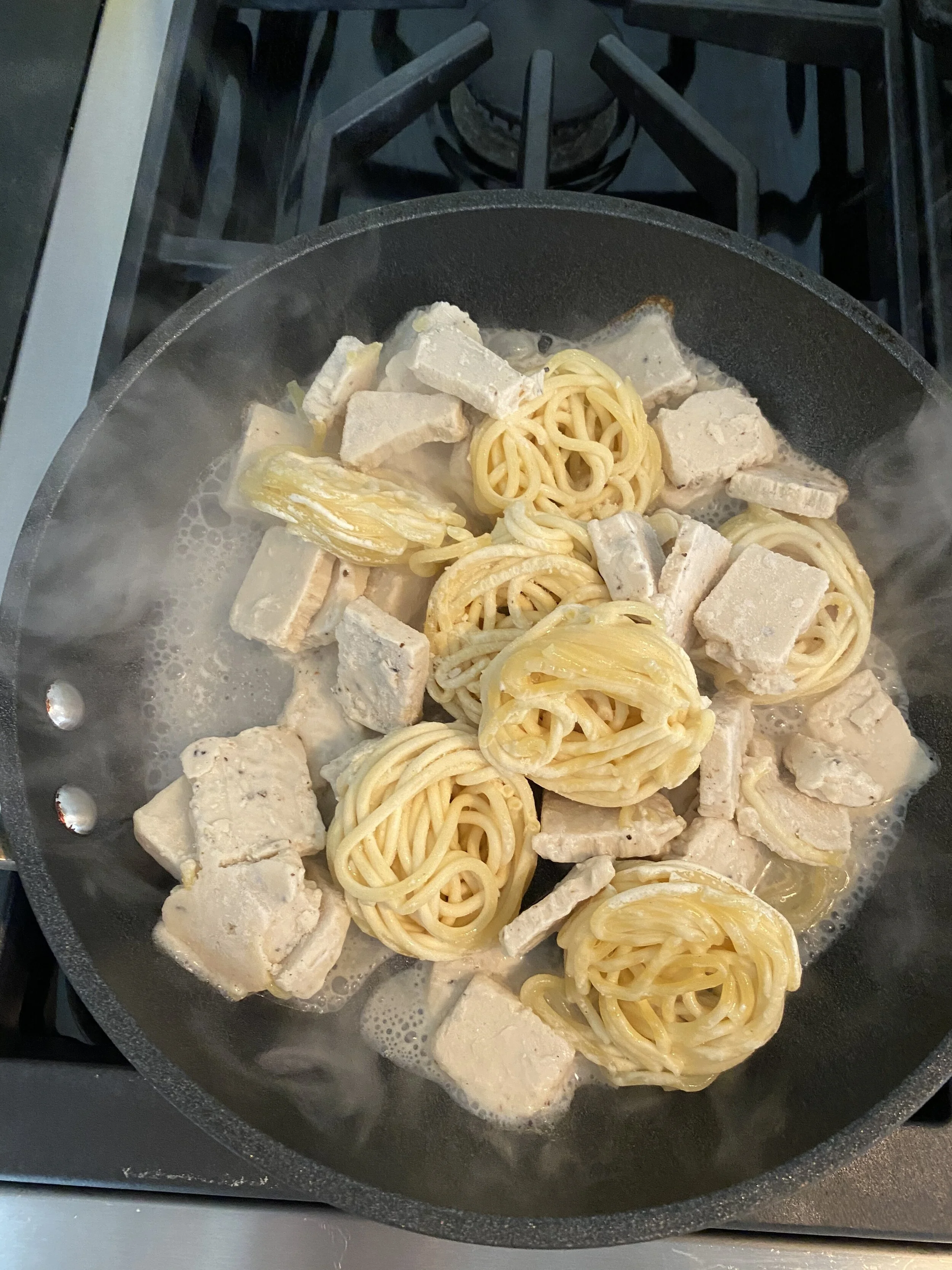 Since this dish is frozen, it comes in an unusual form as you can see from the pic. The sauce is in small cubes and the pasta is in swirls. Once you add some water, the next step is to cover it to cook for around 4 minutes!